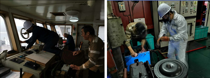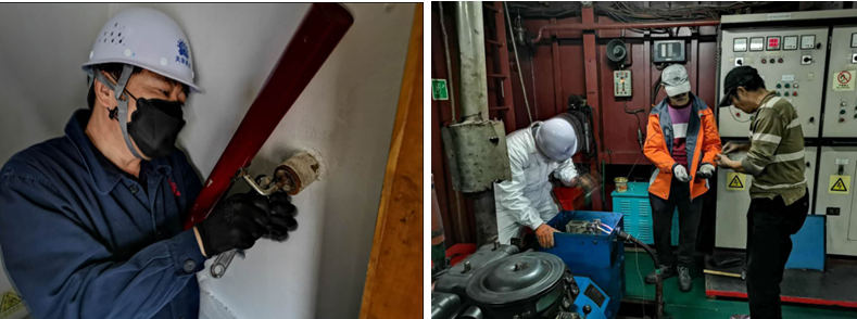 ? ? ? ?7:30到達(dá)碼頭,一行人員沒(méi)有休息片刻,馬上投入到緊張有序的維修保養(yǎng)工作中。根據(jù)船長(zhǎng)反映的維修項(xiàng)目清單,大家先從駕駛臺(tái)入手檢查,薛俊琪雖已年近古稀,但他仍以飽滿的精神狀態(tài),投入到修理工作中來(lái)。首先,他把船舶申請(qǐng)修理的駕駛臺(tái)與船頭船尾的對(duì)講擴(kuò)音設(shè)備修理好,保證駕駛臺(tái)的操船指令能夠及時(shí)傳達(dá)出去。楊總還親自上陣,用從家里帶來(lái)的粘接劑,對(duì)駕駛臺(tái)防風(fēng)玻璃損壞的膠條進(jìn)行修復(fù)和粘接。根據(jù)輪機(jī)長(zhǎng)反映的輔機(jī)時(shí)常跳電現(xiàn)象,馮總和薛俊琪兩人配合,對(duì)輔機(jī)進(jìn)行分析檢查,在機(jī)器馬達(dá)最不顯眼的地方找到了故障,修理過(guò)程中不斷開(kāi)拓思路,創(chuàng)新維修方法,用最原始的工具將兩臺(tái)輔機(jī)全部修理完成。船長(zhǎng)邢光耀和輪機(jī)長(zhǎng)安全對(duì)各位領(lǐng)導(dǎo)的親歷親為非常佩服,表達(dá)感謝之余代表全體船員發(fā)聲:“領(lǐng)導(dǎo)們今日訪船我們真是既欽佩又感動(dòng),大家一定會(huì)以這種精神為榜樣,積極配合公司為船東做好服務(wù),為公司的發(fā)展貢獻(xiàn)自己的綿薄之力!”?